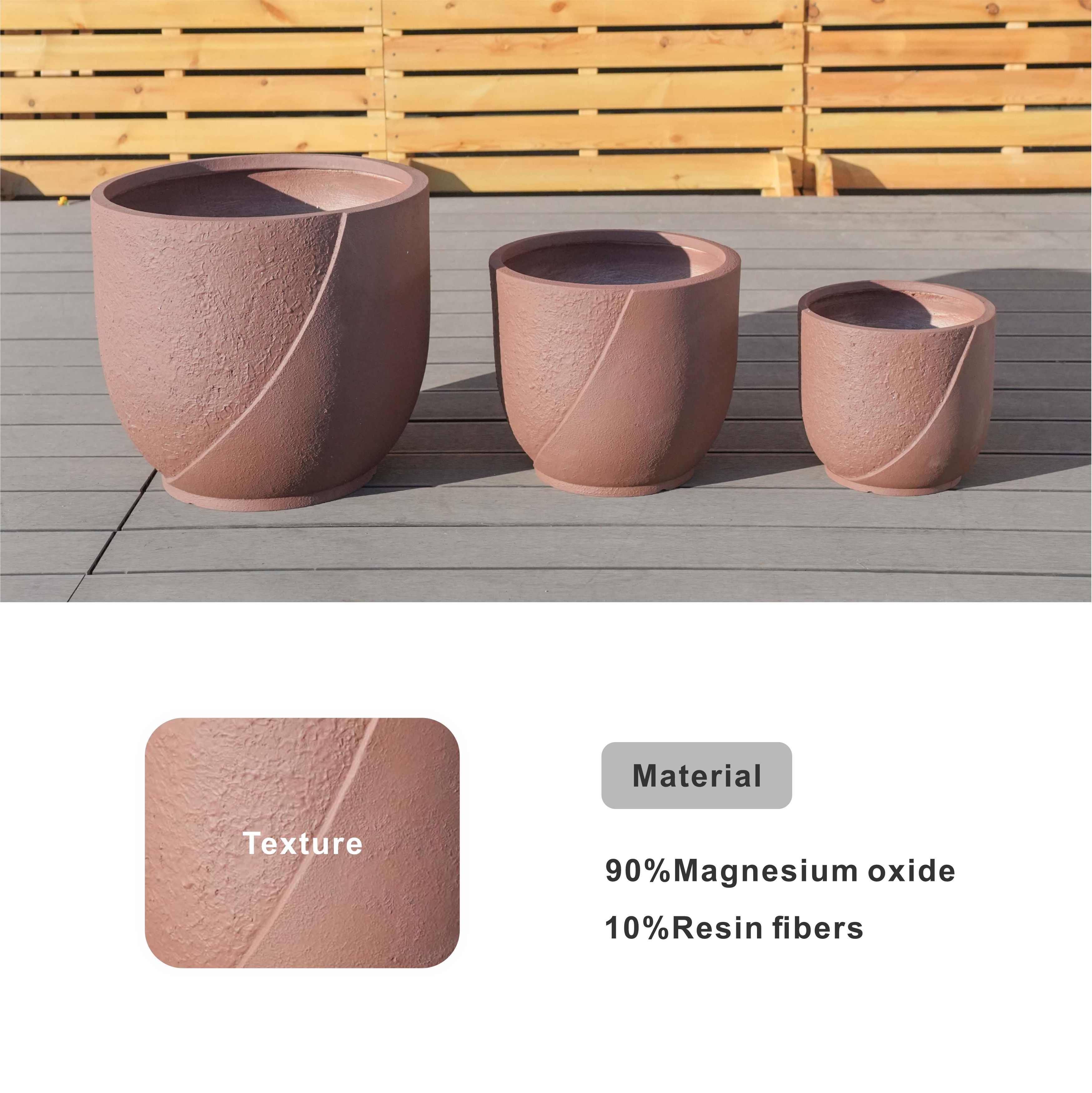 Enhance your outdoor space with this set of garden planters, designed with a sophisticated cement-effect pattern. These planters are crafted from a durable blend of magnesium oxide (90%) and resin fiber (10%), ensuring they are both sturdy and stylish. Each planter comes with a drainage hole, making them perfect for a variety of plants. The set includes three different sizes, allowing you to create a cohesive and attractive arrangement in your garden or patio.