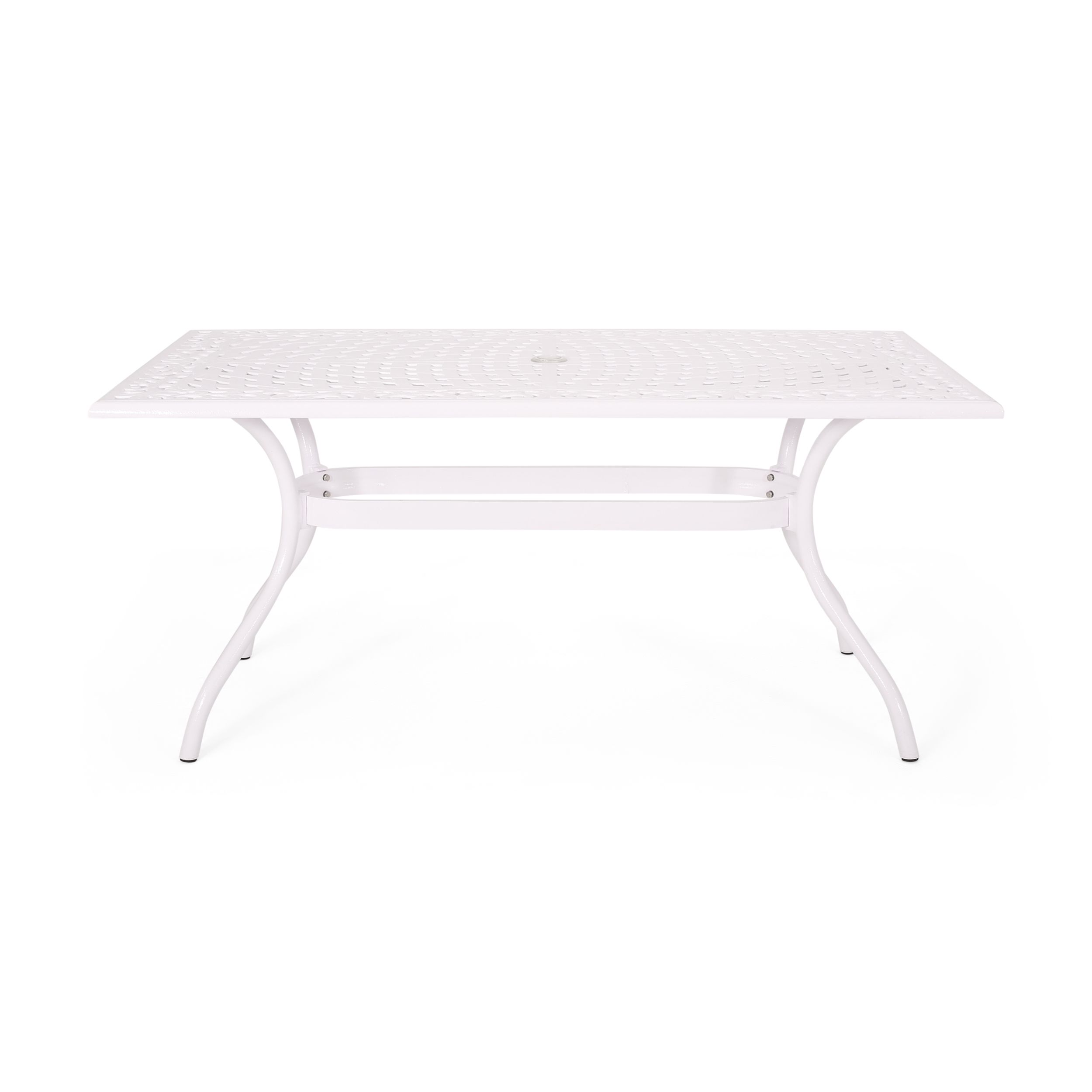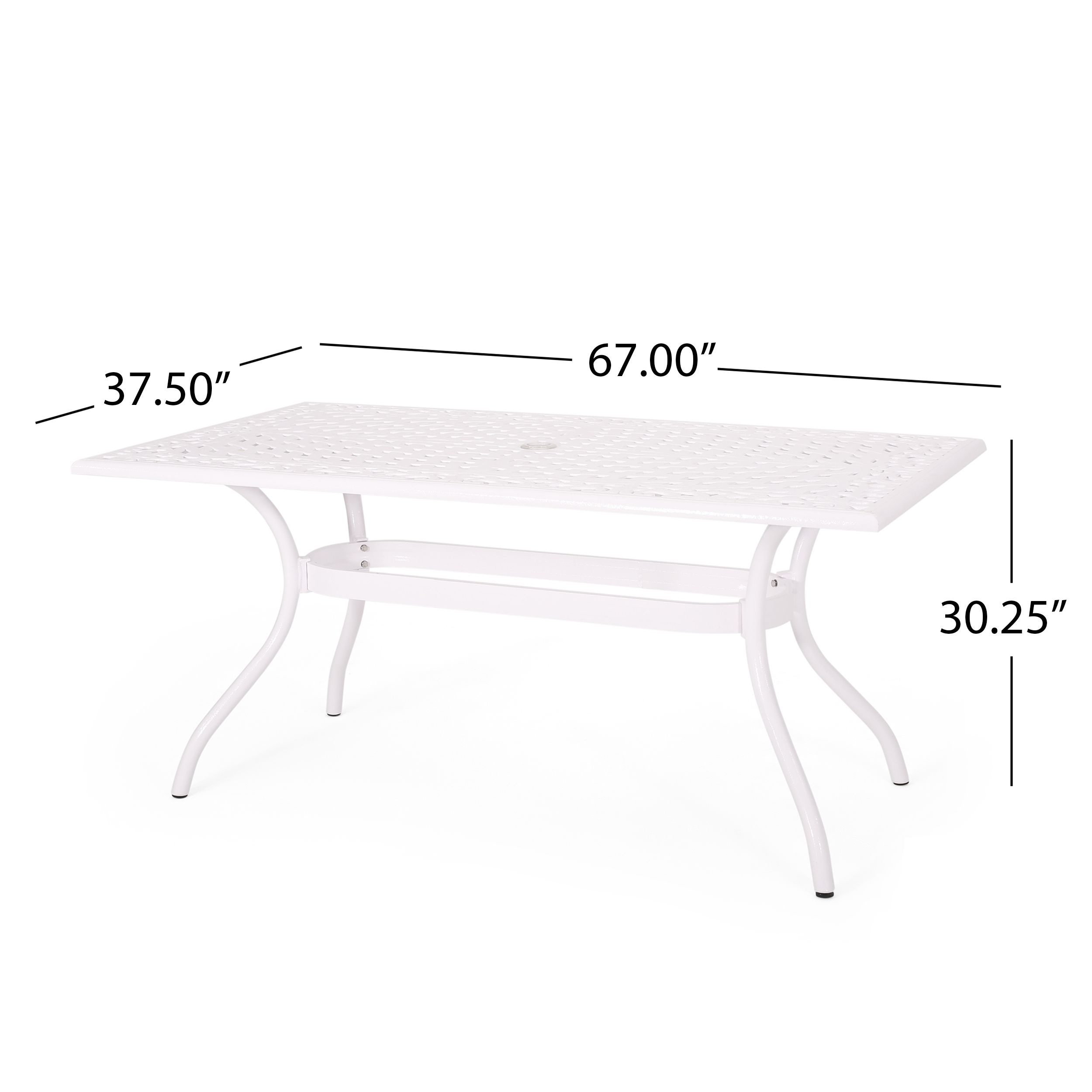 Spend every season relaxing and enjoying meals in nature around this beautiful outdoor dining table. This carefully-crafted table is made of durable cast aluminum that's sure to brave the elements. A classic, yet whimsical lattice design features floral elements for a hint of natural beauty and grace, and curved saber legs complete the traditional look. Replace an old outdoor table with this sophisticated design or use it to start a whole new patio dining space. Move mealtime memories to the pat