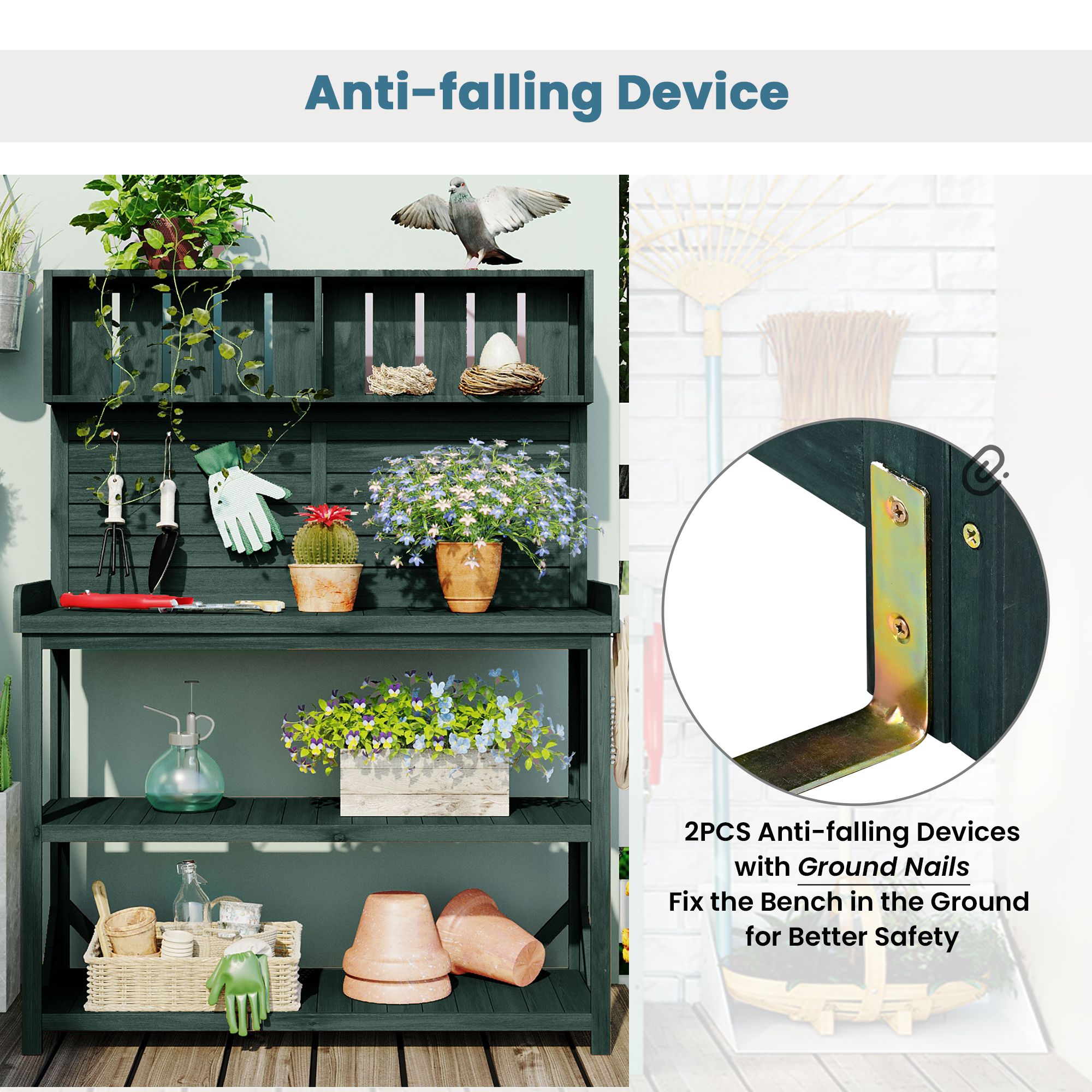 Anti-Falling Safety Device There is not always flat in the garden. For your safety in setting the potting bench; it is designed with an anti-falling device. Just connect the device with wall for better safety. To strength stability; 4 supportive bars are offered to fixed in the lower shelves. They can be fixed in any corner until the table is stable.