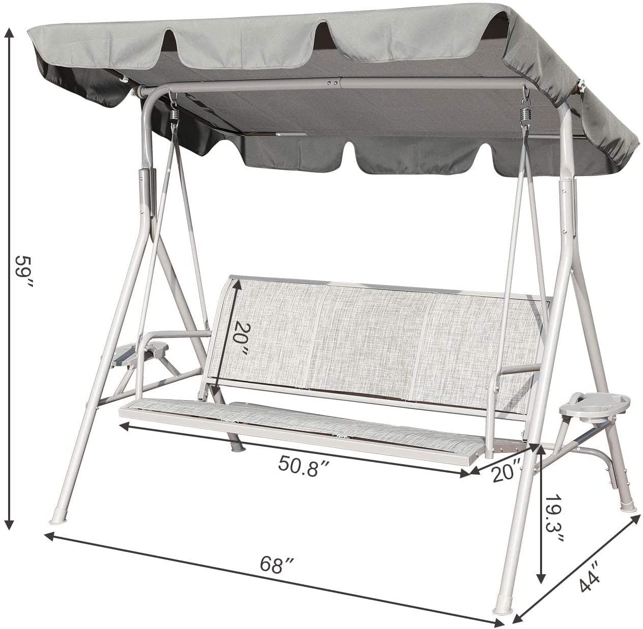 Durable Metal frame supports up to 550 lbs. The Stable triangular base is designed with unique Style Heavy Springs connect the chair to the frame, ensuring a smooth, gentle rocking motion. Perfect for porch, patio, garden, balcony and poolsideThe adjustable canopy can be set at Various angles to provide optimal shade and protection from the sun's harmful UV rays against the rain and dust,Upgraded with 2 Utility Tray, Suitable for holding drinks and food during your leisure timeEasy to assemble and clean.Overall Dimension:67.5"(W)x 44"(D) x 59"(H)