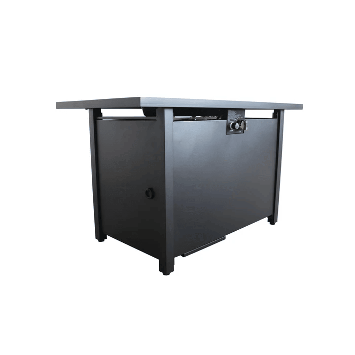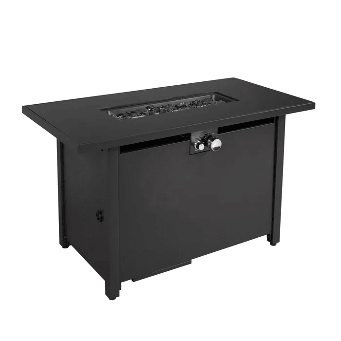 Turn any chilly evening into a cozy gathering with this modern fire pit table. Crafted with a steel base, this table features a neutral finish that resists rust and weather, so it's ready for use on your patio or deck. We love the stainless steel top and included lava rocks that add a contemporary look, while a side door opens for easy access to your propane tank or natural gas (sold separately) and a control panel that has integrated ignition. This fire pit table comes with a protective cover, and it's safe for use on a wood deck.