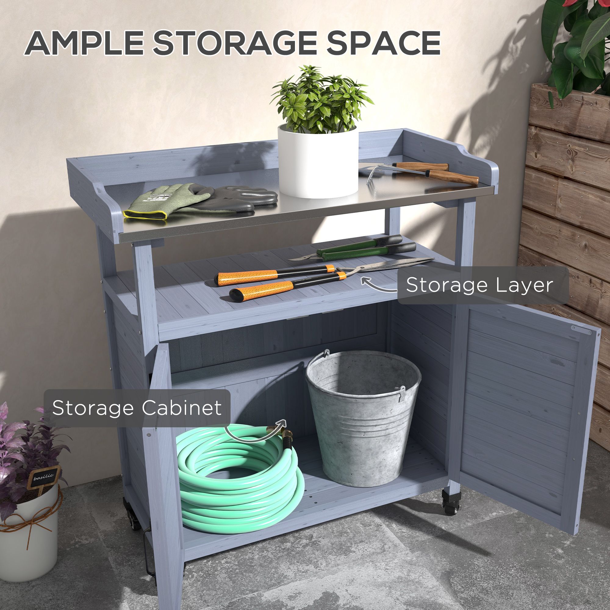 Home > Outsunny Outdoor Potting Bench with Storage Cabinet Aluminum Tabletop Rubber Wheels for Patio Backyard Balcony Gray