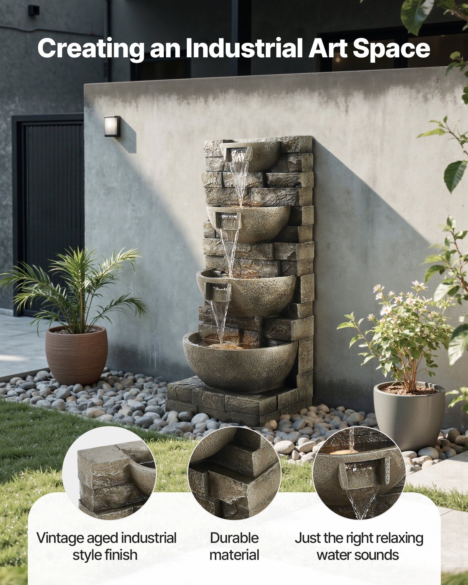 1.Industrial Design: This outdoor water fountain features an industrial-style design, blending vintage and modern elements with a gray color that complements yard, patio, or living room decor, becoming the focal point of your garden or indoor space