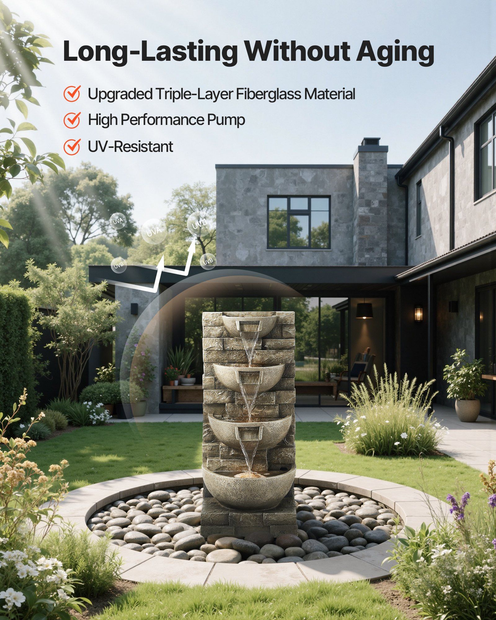 3.Durable Materials: Made from weather-resistant resin and triple-layer fiberglass, this water fountain withstands wind, harsh sunlight, and extreme temperatures. It's built to last and remains colorfast, ideal for gardens, yards, and patios