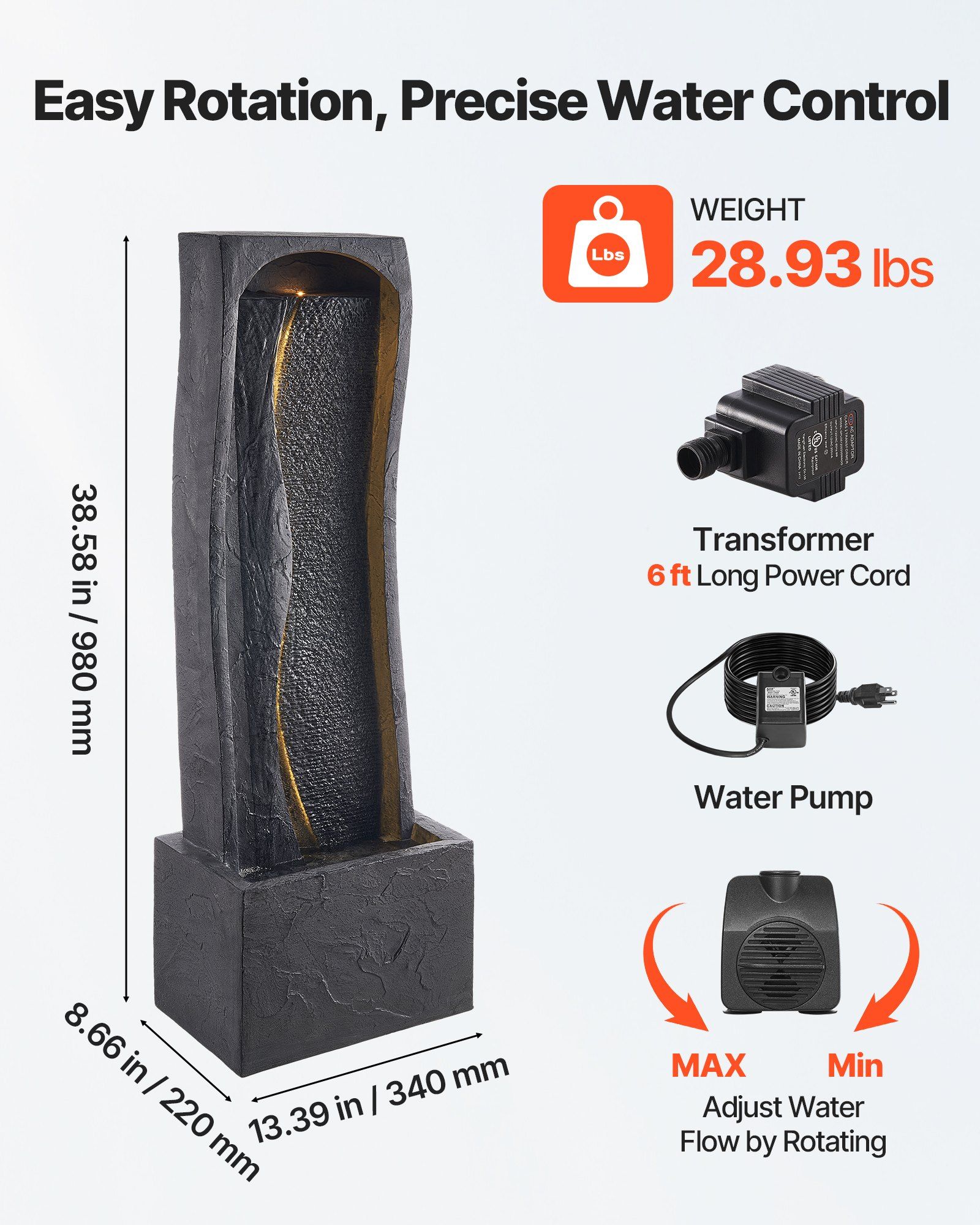 4.LED Lighting: The yard water fountain features built-in soft LED lights, creating a calming lighting effect at night. With a 6 ft power cord and dual power supplies for the pump and light, it's easy to maintain and adaptable to various settings
