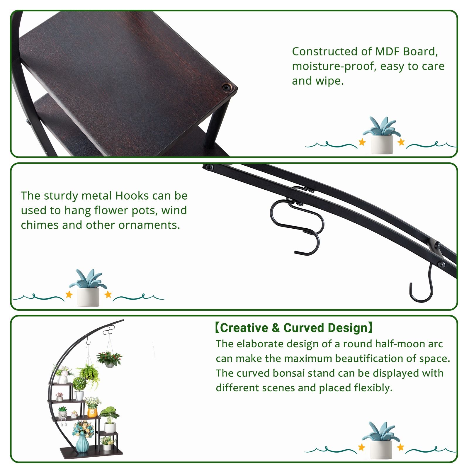 1.Space-Saving Design: With five tiers in a semi-circle shape, this plant stand maximizes vertical space, allowing you to display multiple plants in a compact area, ideal for small gardens, balconies, and patios.