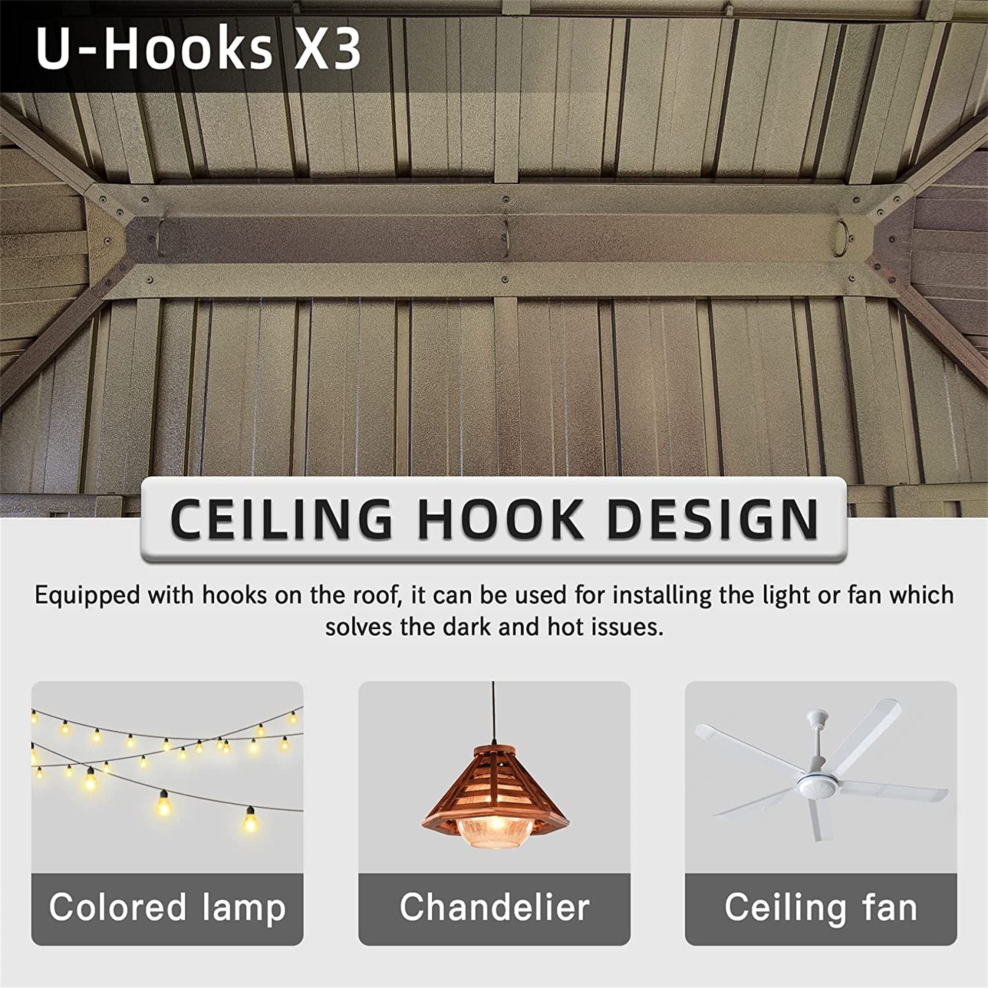 [VENTILATED DOUBLE TOP DESIGN]This outdoor patio gazebo designed with a ventilated double-layer galvanized steel roof to provide a healthy and airy space.Features a galvanized steel sheet top that prevents fading and prolongs service life.