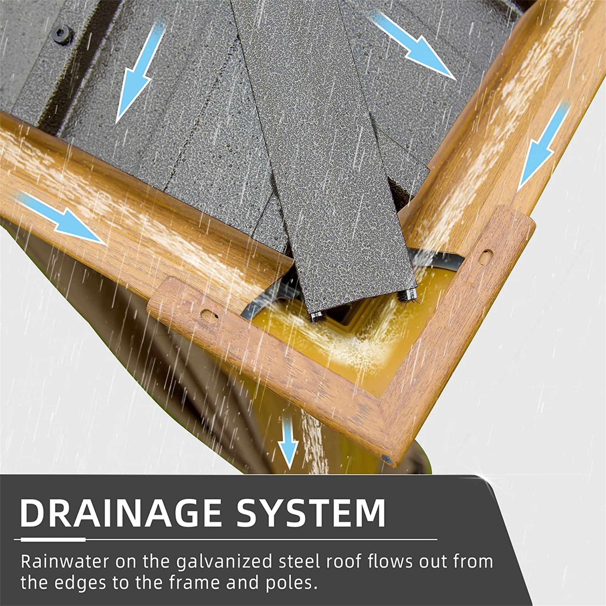 [Water Gutter Design]The unique design of our double roof metal gazebo canopy allows rainwater to flow from the eaves leaks to the pole till ground,reduce the hassle of rain and snow. The unique and targeted design keeps the gazebo in good condition and prolongs its lifespan.