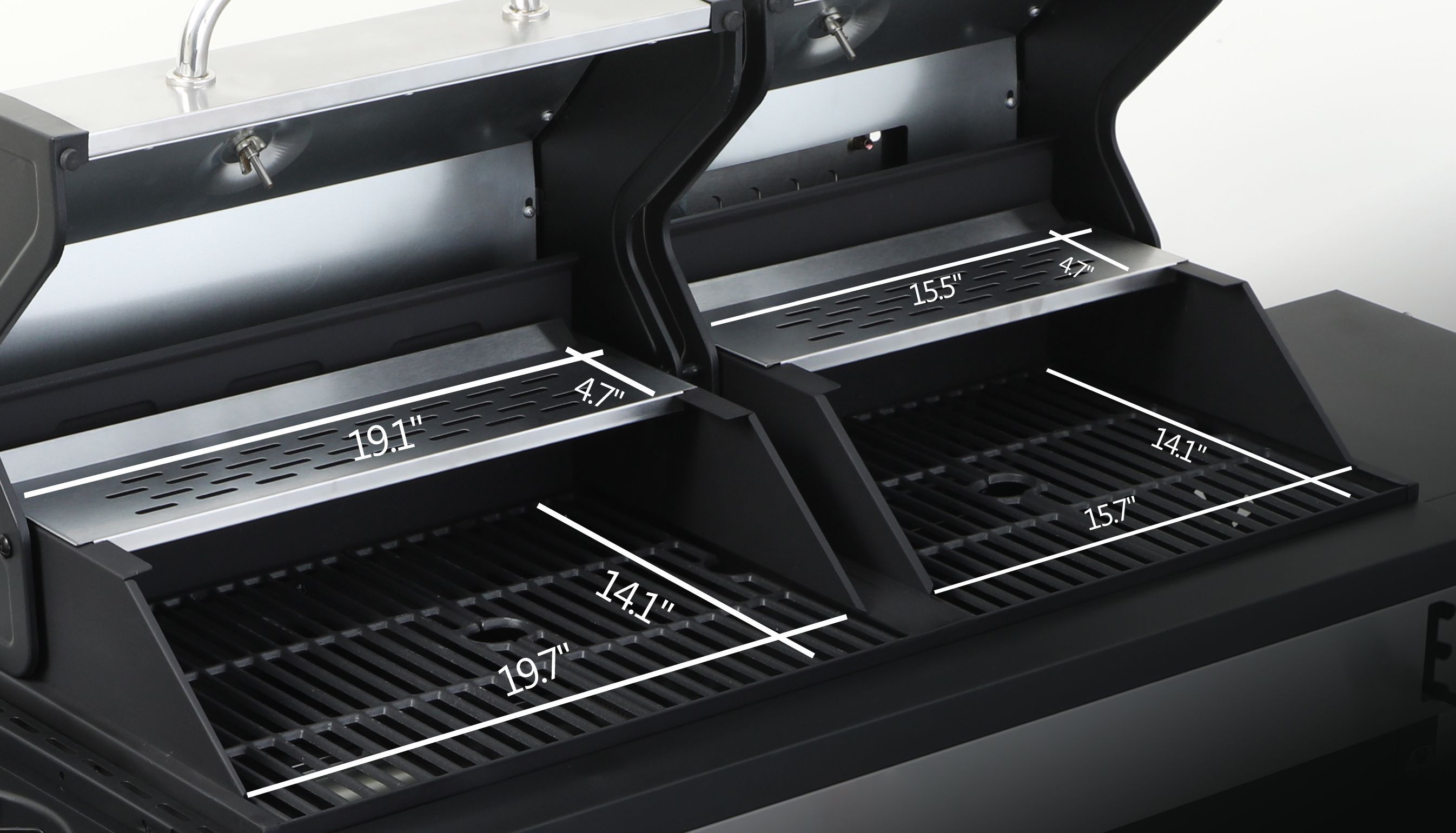 [Enamel cast iron cooking grids]: Charcoal side:2pcs 7.9x14.4inch; Gas side: 1pc 7.9x14.4inch + 1pc 11.8x14.4inch