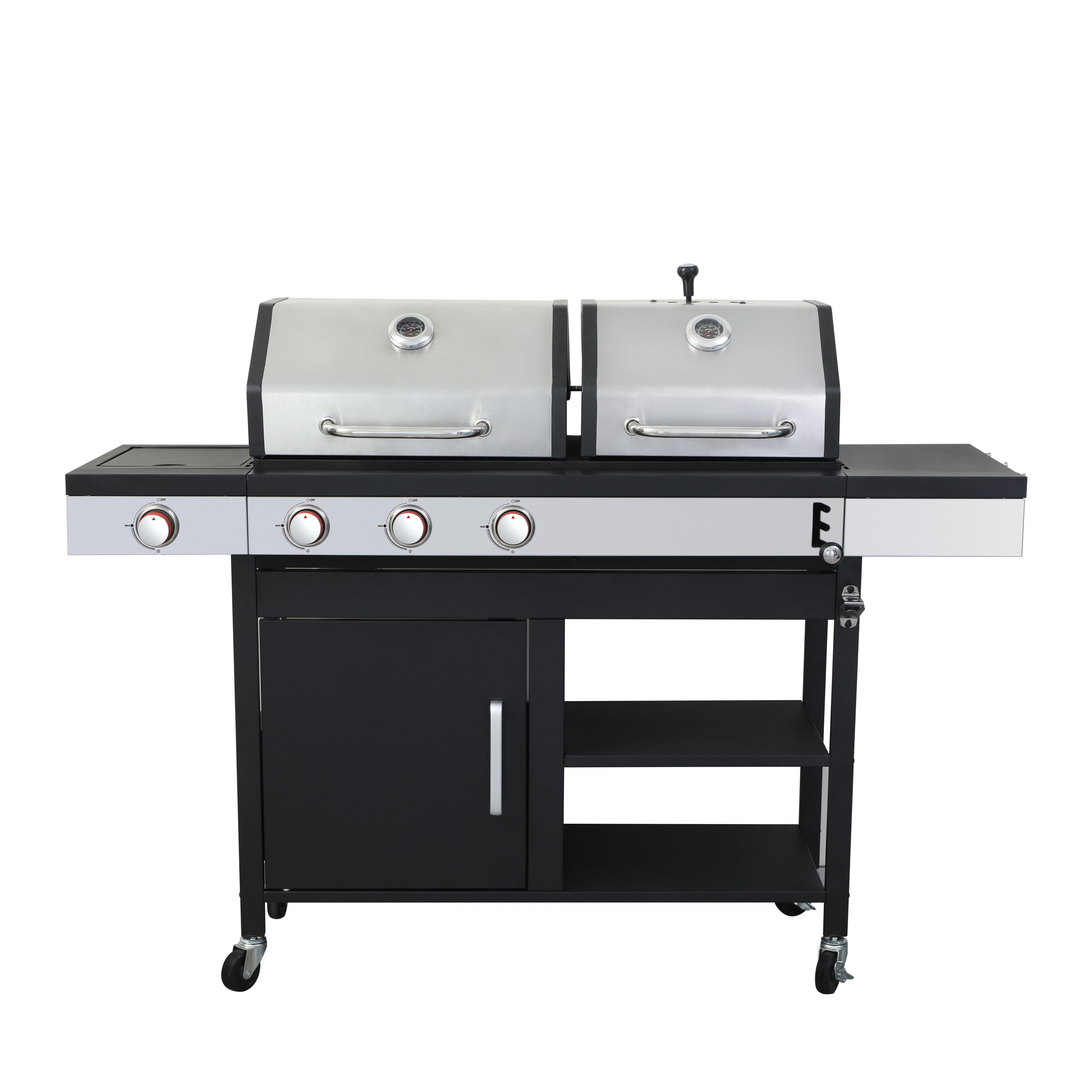 3-Burner Propane Gas BBQ Grill with Side Burner, combined with charcoal grill