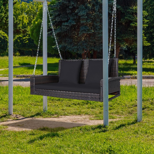 Solid steel chains ensure stable and safe swinging Sturdy and anti-rust steel for long-time usePE rattan surface is high-quality and weather resistant2-seat design enhances communication with friends2 back cushions and 1 seat cushion offer extra comfortZippered design makes maintenance much easierCan be hanged in multiple occasions with two strong steel chainsPlease purchase extra chains if you want to hang the swing on the ceilingEasy assembly with clear instructions and all hardwar