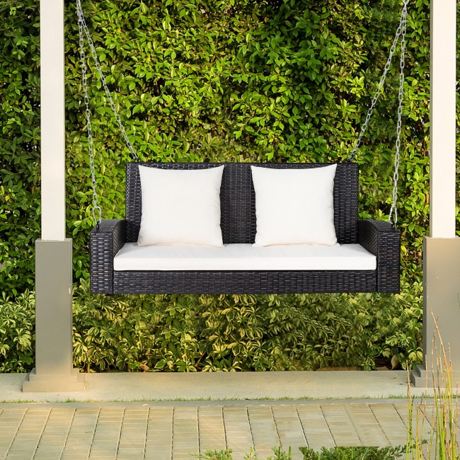 Solid steel chains ensure stable and safe swinging Sturdy and anti-rust steel for long-time usePE rattan surface is high-quality and weather resistant2-seat design enhances communication with friends2 back cushions and 1 seat cushion offer extra comfortZippered design makes maintenance much easierCan be hanged in multiple occasions with two strong steel chainsPlease purchase extra chains if you want to hang the swing on the ceilingEasy assembly with clear instructions and all hardwar