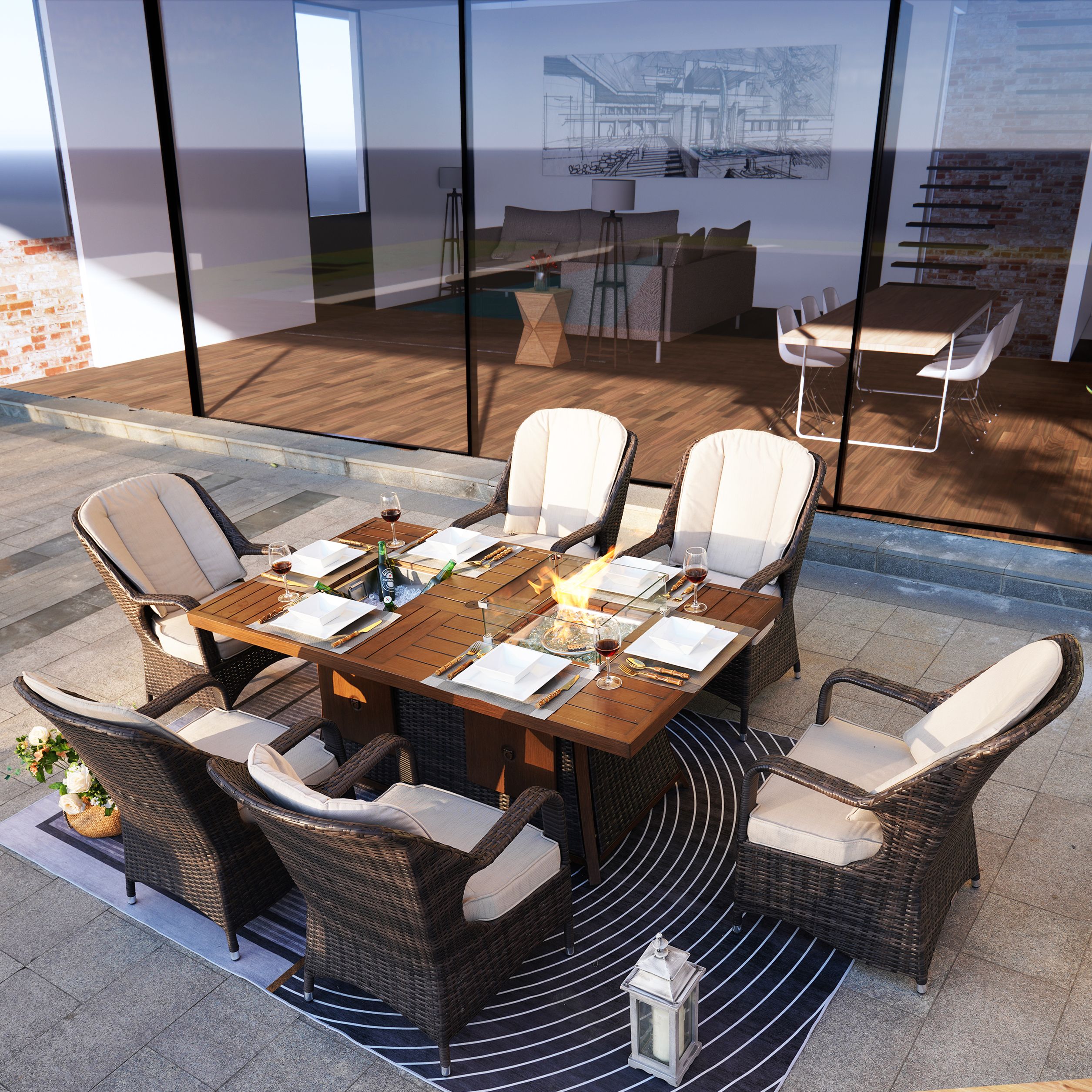 Direct Wicker 7 PCS Patio Gas Firepit and Ice Container Rectangle Dining Set with 6 Standard Height Chairs