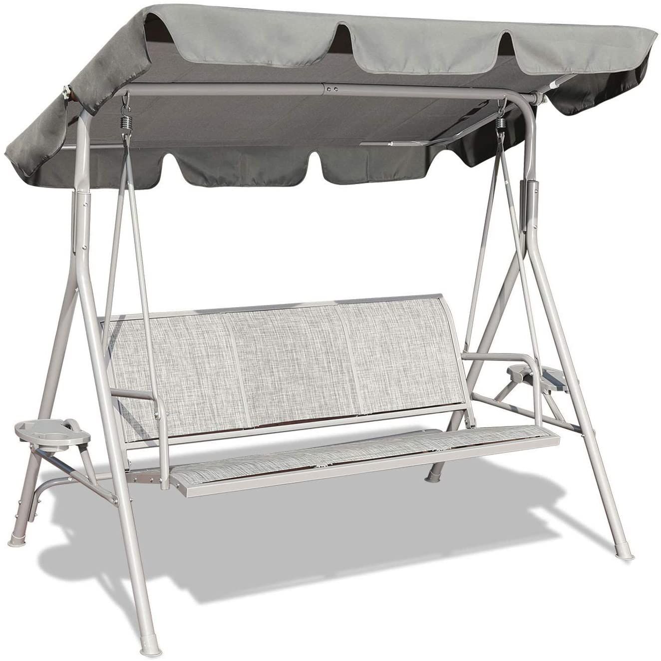 Durable Metal frame supports up to 550 lbs. The Stable triangular base is designed with unique Style Heavy Springs connect the chair to the frame, ensuring a smooth, gentle rocking motion. Perfect for porch, patio, garden, balcony and poolsideThe adjustable canopy can be set at Various angles to provide optimal shade and protection from the sun's harmful UV rays against the rain and dust,Upgraded with 2 Utility Tray, Suitable for holding drinks and food during your leisure timeEasy to assemble and clean.Overall Dimension:67.5"(W)x 44"(D) x 59"(H)