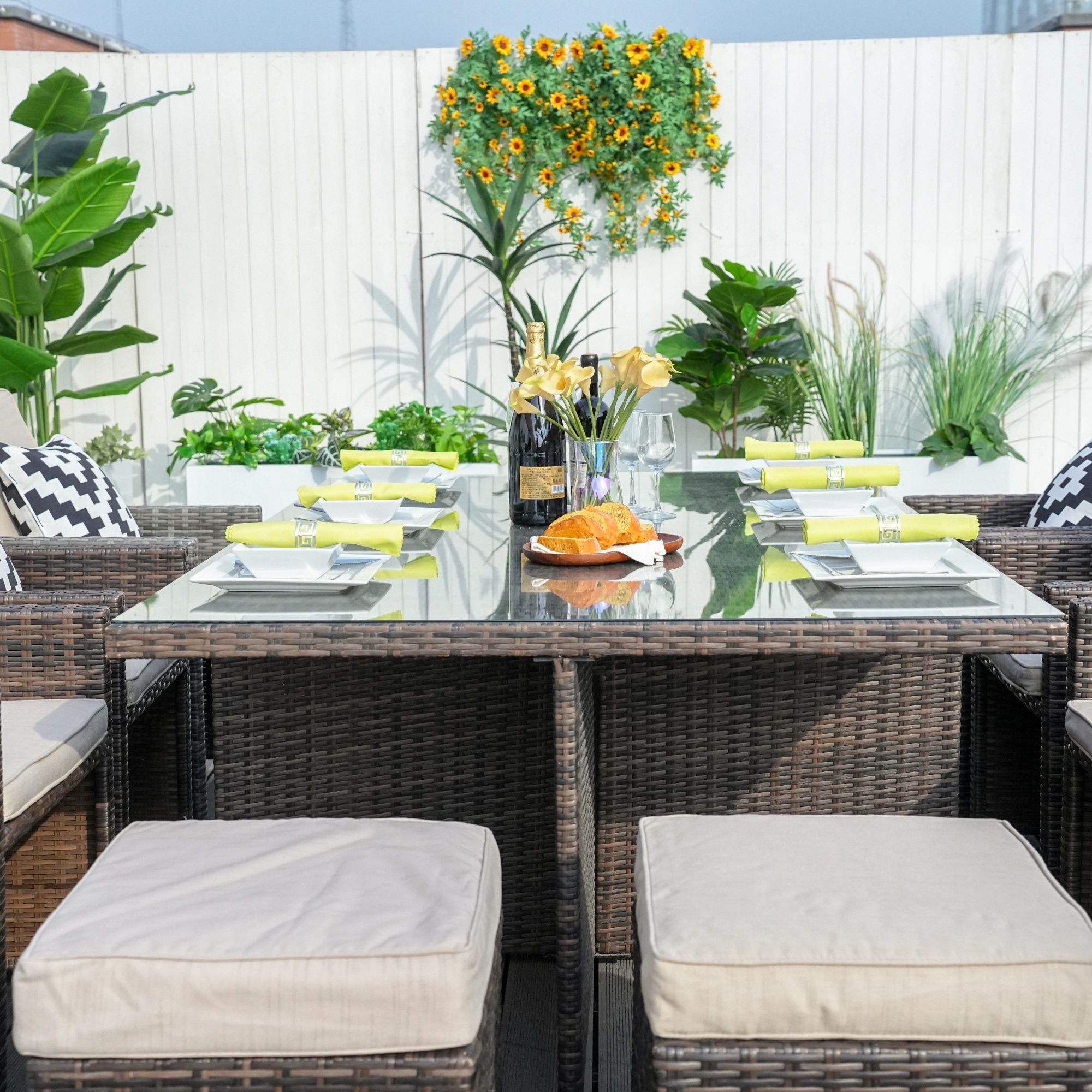 Get the outdoor seating you need with our Direct Wicker Complete 10 Seater Rattan Set. Including 6 chairs; 4 foot stools and a center table; this outdoor furniture set is the perfect option for those that need plenty of seating for casual usage or entertaining outdoors. Crafted with high quality woven water resistant rattan; this set is suitable for varying weather conditions all year round. Modern geometric chairs with matching stools provide complete relaxation for yourself and guests; allowing you to comfortably lounge while outside. With a specialized table base design structure; the furniture pieces seamlessly fit together; allowing for excellent coverage and shielding from the elements when left outdoors for prolonged periods of time. A thick sheet of tempered glass lays across the center table; providing easy cleanup and an ideal surface for entertaining with food and drinks.