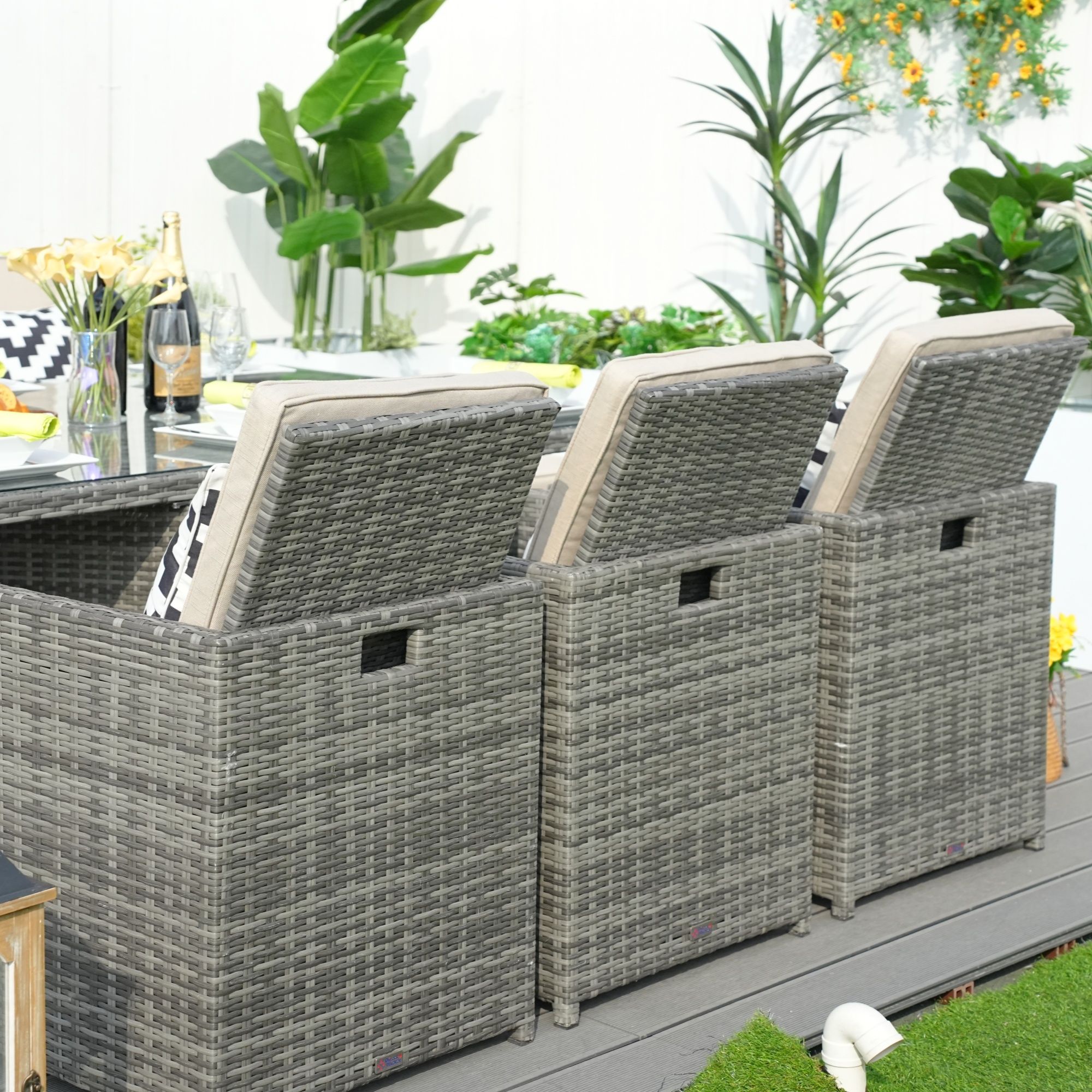 Get the outdoor seating you need with our Direct Wicker Complete 10 Seater Rattan Set. Including 6 chairs; 4 foot stools and a center table; this outdoor furniture set is the perfect option for those that need plenty of seating for casual usage or entertaining outdoors. Crafted with high quality woven water resistant rattan; this set is suitable for varying weather conditions all year round. Modern geometric chairs with matching stools provide complete relaxation for yourself and guests; allowing you to comfortably lounge while outside. With a specialized table base design structure; the furniture pieces seamlessly fit together; allowing for excellent coverage and shielding from the elements when left outdoors for prolonged periods of time. A thick sheet of tempered glass lays across the center table; providing easy cleanup and an ideal surface for entertaining with food and drinks.