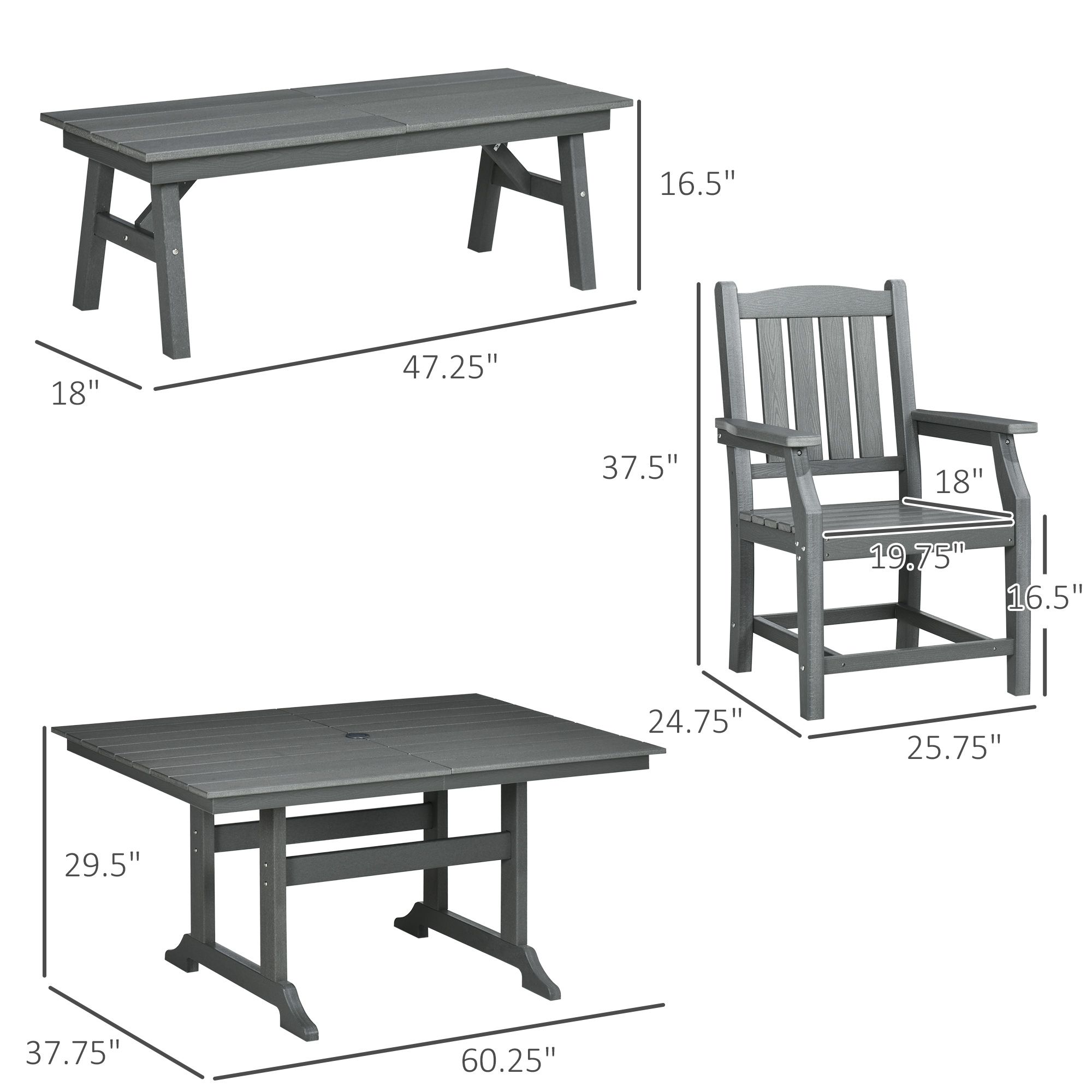 Want a place to put on backyard barbeques and cozy campfires? Like to read in the breeze? Need a table and chairs? Outsunny has an outdoor dining table and chairs set to help you put on the picnic of your dreams. Keep comfy, sitting on a cushioned surface. Featuring four chairs and a dining bench with a farmhouse look, our HDPE furniture is outdoor ready. The table features a central umbrella hole for the umbrella of your choice. Put some party into your patio with Outsunny.