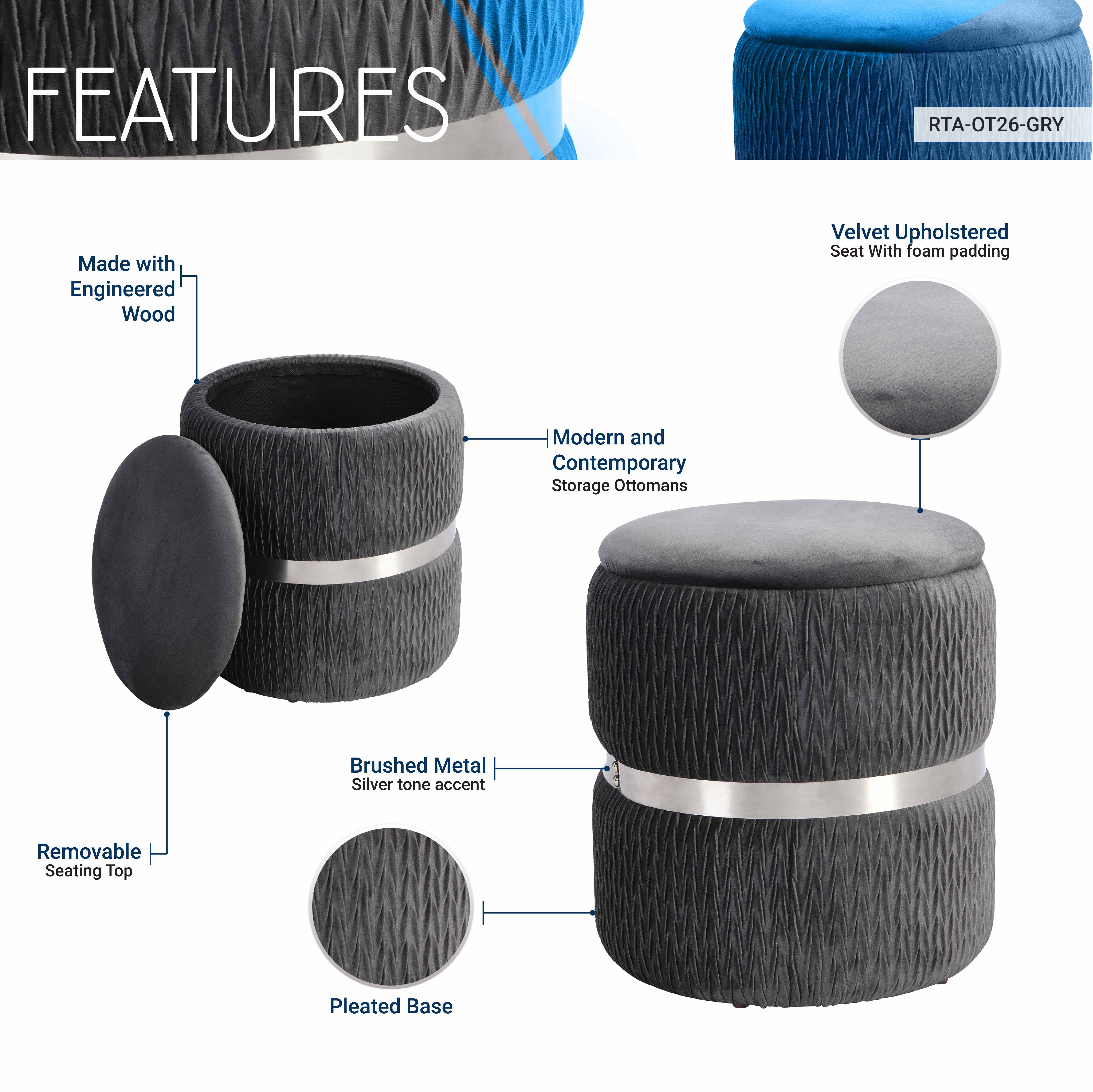 Modern Velvet Round Ottoman with Storage, GreyIntroducing the ultimate solution to your storage and seating needs - the Tufted, Modern Round Velvet Storage Ottoman! This beautifully crafted piece of furniture is stylish and comfortable and provides ample storage space to keep your home organized and clutter-free. With its plush velvet exterior, and sturdy, round base, this tufted ottoman is the perfect addition to any living room, bedroom, or entryway. Whether you use it as a footstool, extra seating, or even as a coffee table, you'll love its comfort and convenience. Weight limit: 250 lbs. Color: Grey and Silver.
