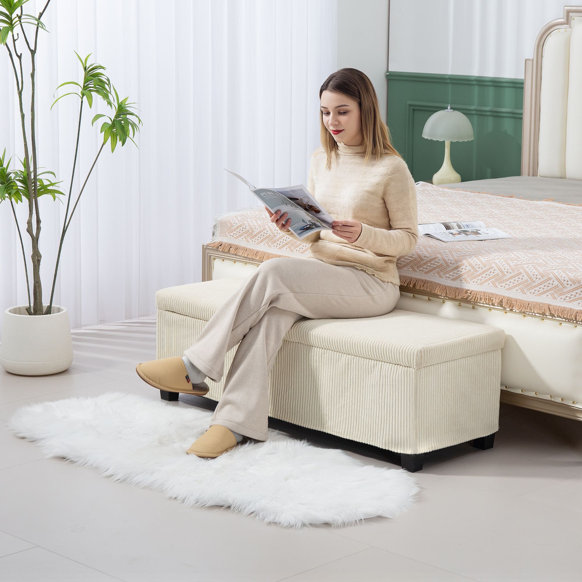 1.- Stylish Elegance, Long-Lasting Comfort: Upholstered in a breathable, skin-friendly, and wear-resistant corduroy fabric, padded with soft original foam, this ottoman storage combines beauty, comfort, and durability, whether as a footrest or an extra seat