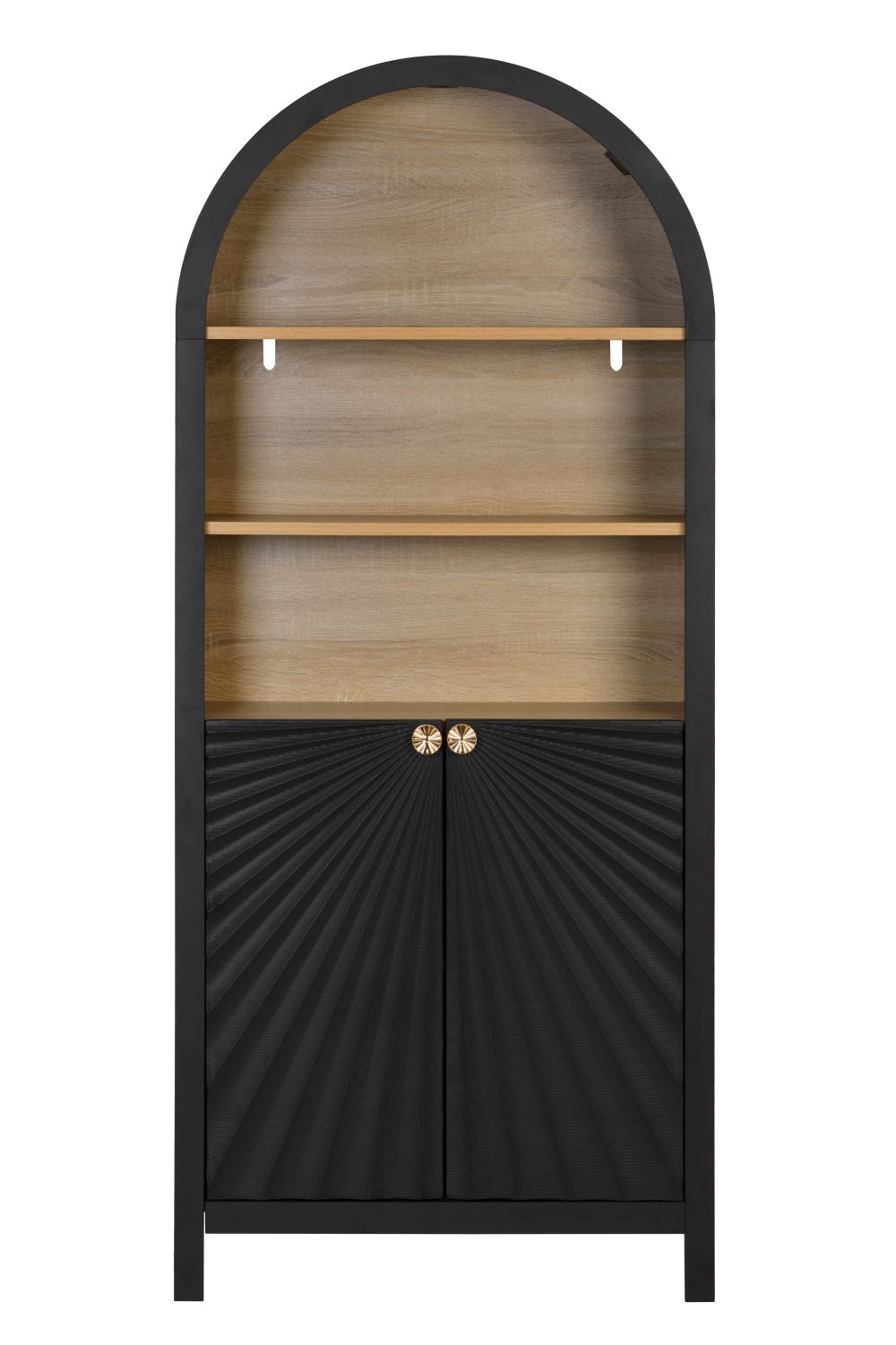 The elegant arch details and radial pattern door design give this bookshelf a timeless appearance, perfect for any home. It beautifully blends classic artistic beauty with modern simplicity, enhancing both style and storage functionality. Pair it with your favorite books and indoor plants for a charming display