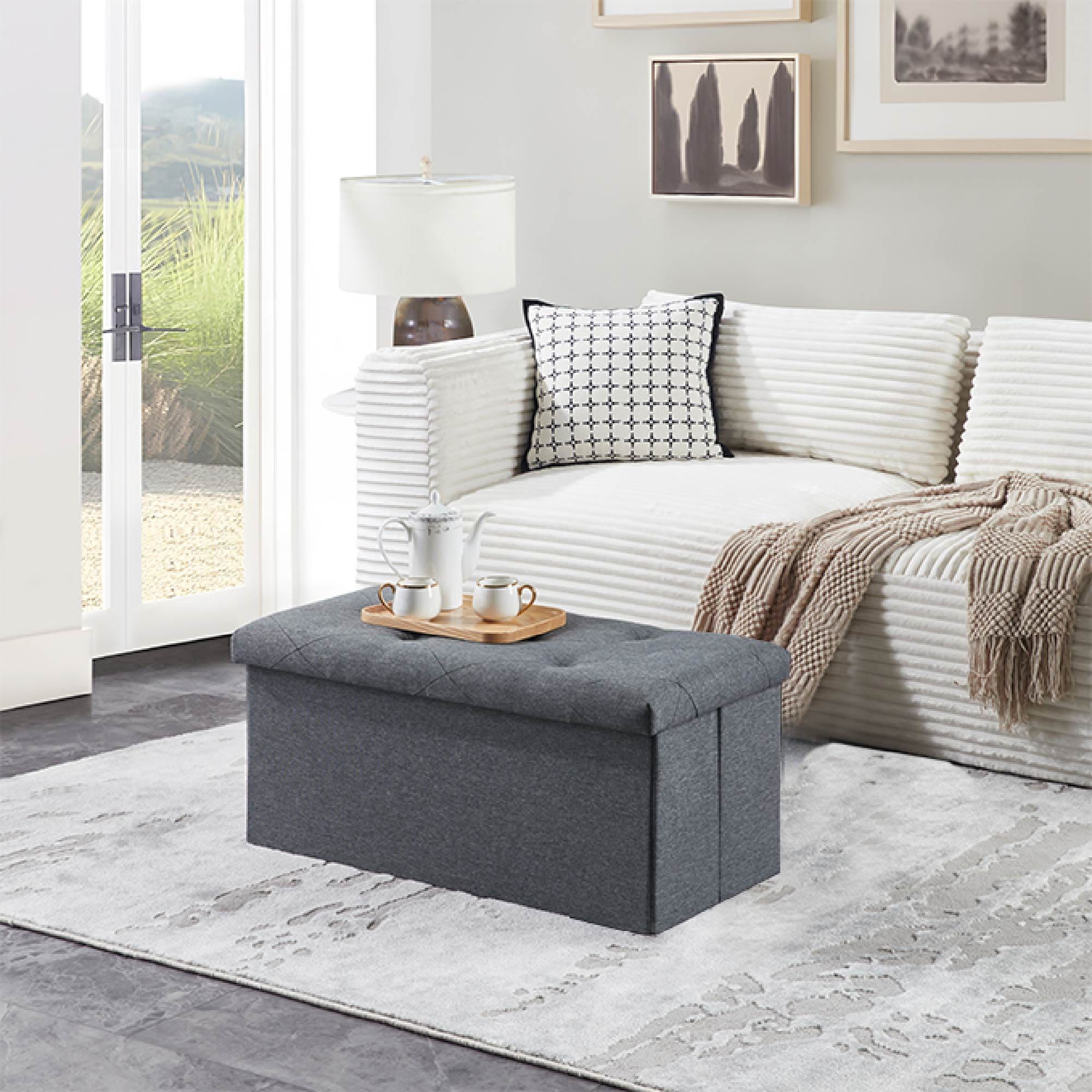 3. "[Premium Comfort & Style]": "Padded with thick sponge and wrapped in soft Linen fabric for a cozy seat, paired with sleek gray tones to match any decor. Traditional-style tufts create a unique fascination, making this folding storage bench an real eye-catcher no matter where it is placed."